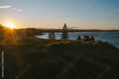 Obraz premium Friends enjoying scenic sunset overlooking ocean from grassy hilltop