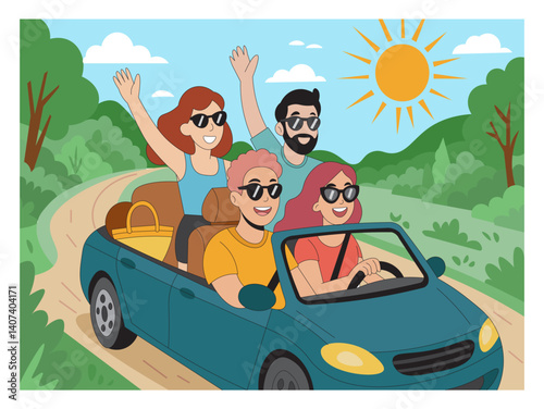 Fototapeta premium Friends Enjoying Summer Road Trip in a Convertible Cartoon Vector...