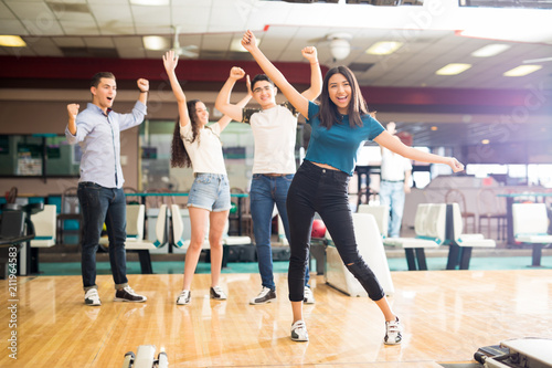 Naklejka premium Friends Enjoying Victory At Bowling Club