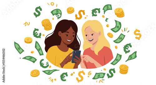 © Maureen, Obraz premium Friends exploring currency symbols: digital payment adventure vector illustration for print and web design