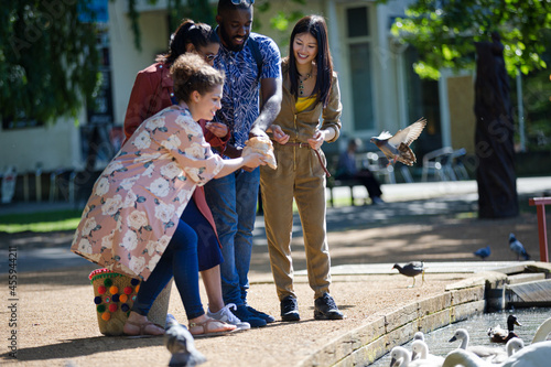 © KOTO, Fototapeta premium Friends feeding ducks and geese at sunny park pond