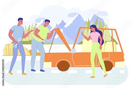 Fototapeta premium Friends Have Problem with Car on Countryside Road.