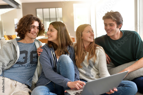 © goodluz, Fototapeta premium Friends having fun at home connected on laptop