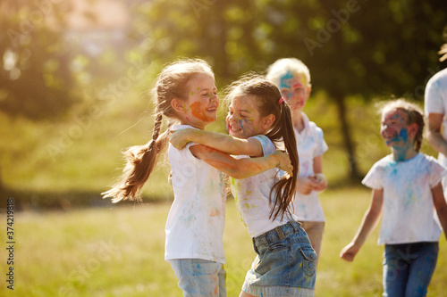 Fototapeta premium Friends having fun with powder paint on a sunny day. Selective focus