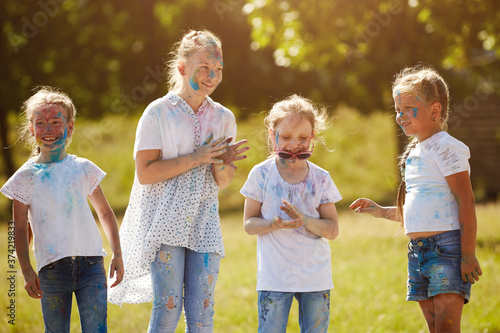 Fototapeta premium Friends having fun with powder paint on a sunny day. Selective focus