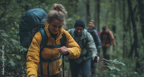 © พงศ์พล วันดี, Obraz premium Friends Hiking Together in a Dense Forest