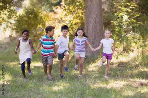 © WavebreakMediaMicro, Fototapeta premium Friends holding hands while running at campsite