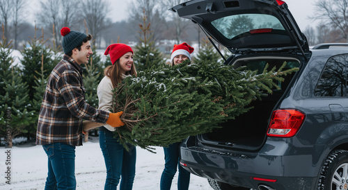 © Running opossum, Naklejka premium friends loading christmas tree into car on snowy day at outdoor tree farm
