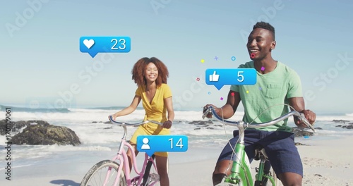 Fototapeta premium Friends pedaling pink, green bikes on beach with rocky outcrops, with blue notification icons