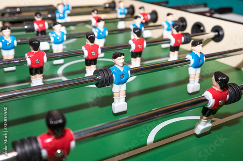 © Yulia, Fototapeta premium Friends Playing Table Soccer Game. table football or kicker with miniature players. game table. Games, entertainment, hobbies and leisure.foosball.plastic players in the table soccer.game kicker