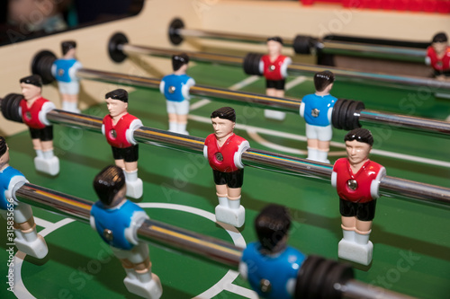 © Yulia, Fototapeta premium Friends Playing Table Soccer Game. table football or kicker with miniature players. game table. Games, entertainment, hobbies and leisure.foosball.plastic players in the table soccer.game kicker