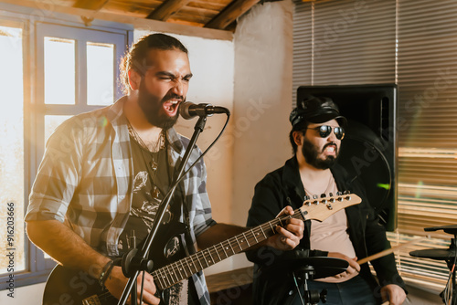 Fototapeta premium Friends rehearsing at home, guitar and drums. Music band. International music...