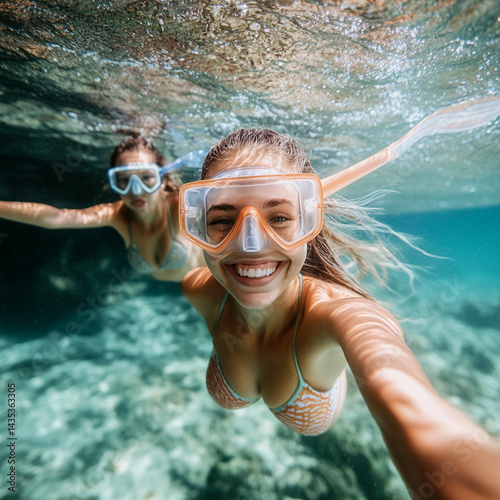 Fototapeta premium Friends snorkeling among tropical fish in crystal water