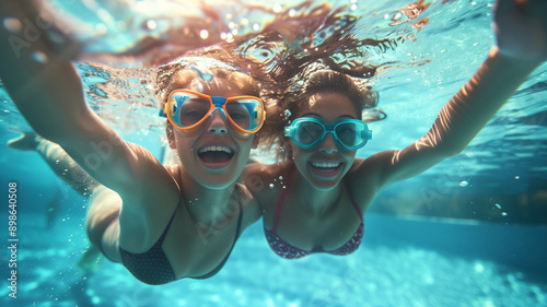 Fototapeta premium friends snorkeling underwater, smiling and having fun in the clear blue ocean during a sunny summer vacation.