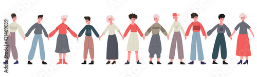 © WinWin, Naklejka premium Friends standing together. Group of happy friends holding hands, happiness and friendship. Smiling people stand in row together vector illustration set