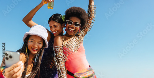 Obraz premium Friends take a sunny carnival selfie on the beach