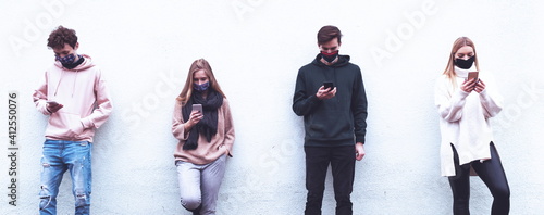 Naklejka premium Friends using mobiles covered with mask during Covid-19 out brake -...