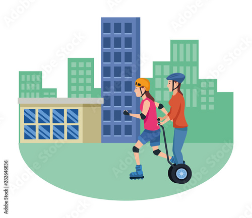 Fototapeta premium Friends with electric scooter and skateboard