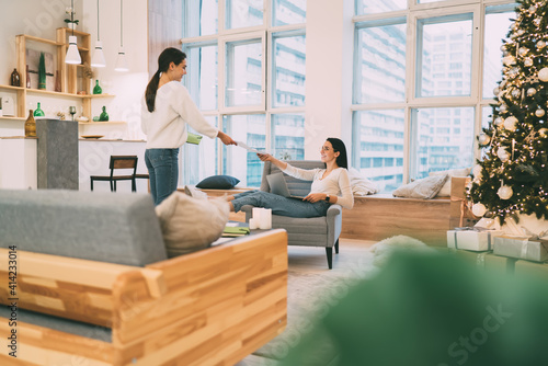 © BullRun, Fototapeta premium Friends working on project at home with Christmas decorations