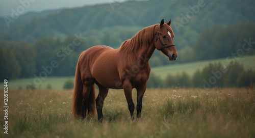 © TheWaterMeloonProjec, Fototapeta premium Friesian mare standing in a lush field