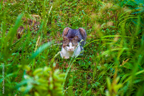 Obraz premium Frightened cat hides in the grass. homeless tabby cat, lost pet