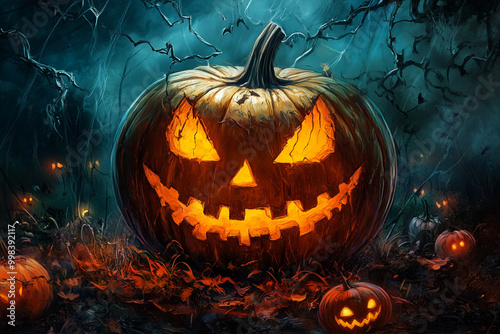 Fototapeta premium Frighteningly Delightful Halloween Pumpkin Glowing in the Dark With Bright,...