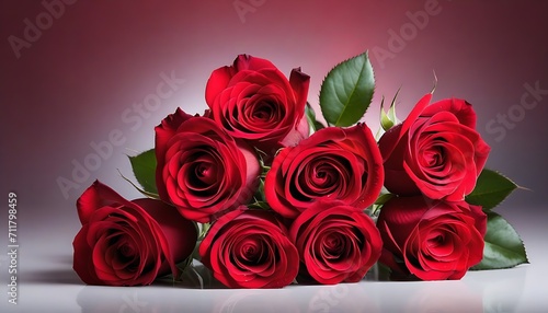 © Lied, Obraz premium Frintview of a red roses bouquet on white marble table, red background
