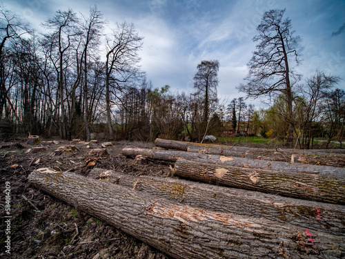 © focus finder, Obraz premium Frisch gefällte und markierte Baumstämme