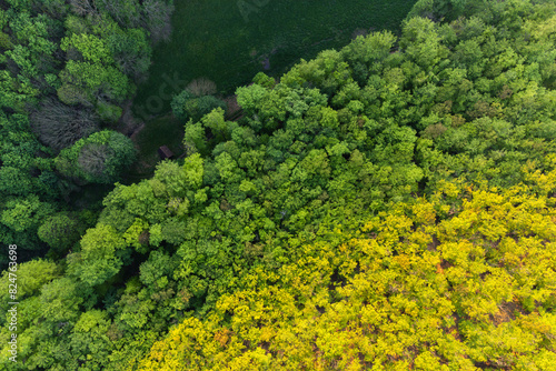 Naklejka premium Frischer Mischwald Luftaufnahme. Grüne Baumkronen