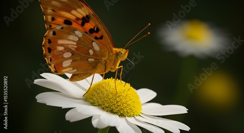 © Lukman, Obraz premium Fritillary Butterfly on Chamomile – Macro Shot