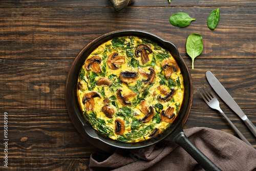 © voltan, Obraz premium Frittata with spinach and champignon mushrooms in cast iron skillet
