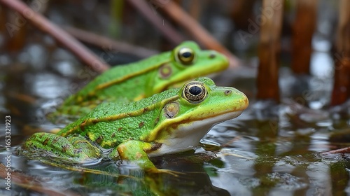Fototapeta premium Frog habitats in wetlands, ponds, or forests with amphibians resting or leaping, perfect for environmental and biodiversity stock content