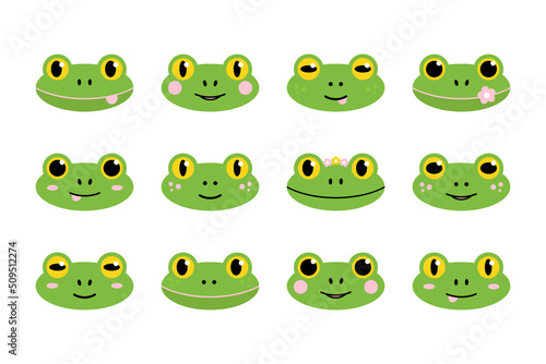 © cosmic_pony, Fototapeta premium Frog icons. Big set, collection of cute cartoon style green frog characters faces, emoji.