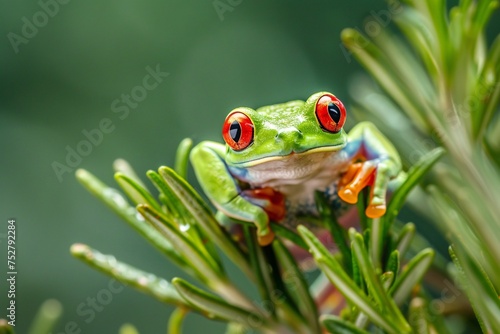 Fototapeta premium Frog in Focus A Close-Up of a Green Frog with Red Eyes Generative AI