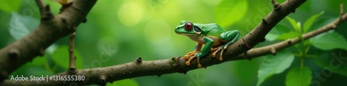 © Uravan, Obraz premium Frog in tree branch with leaves and branches intertwined, habitat, nature