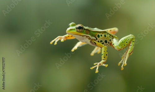 © Ľudovt, Fototapeta premium frog mid-jump among the forest foliage, showcasing the dynamic motion and natural habitat.