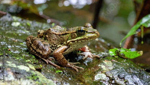 Fototapeta premium Frog on Mossy Rock: Capturing a vibrant macro shot, a detailed view of a frog resting on a moss-covered rock, immersed in its natural habitat.