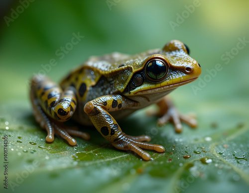 © Clear, Fototapeta premium Frog Sitting on a Leaf with Water Droplets Close Up