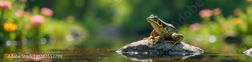 Naklejka premium Frog sitting on a rock near a pond with flowers and trees, trees, rock, outdoors