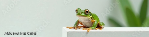 © Kachaphot, Obraz premium Frog sitting on a white panel, frog, white panel, water