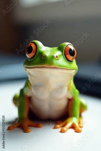 © Phennapha, Fototapeta premium Frog sitting on white desk, office, frog on desk