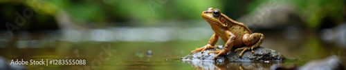 © OneWayPhoto, Fototapeta premium Frog taking a mud bath on a rock in a forest stream, natural, forest, stream