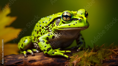 © Ishika, Naklejka premium frog that is sitting on a log with a flower Generative AI