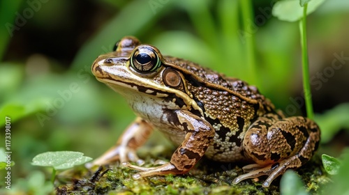 © Aracazen, Obraz premium Frog with green leaf close up