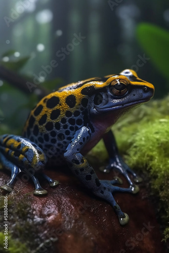 © Vika art, Obraz premium Frog with large dramatic eyes sits on a tree trunk with mossy bark, and lush foliage, the leaves are covered with raindrops. a beautiful natural environment surrounded by jungle. Generative AI