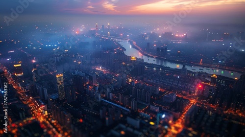 © Justlight, Fototapeta premium From a birds eye view the city at dusk is a sprawling intricate mosaic of lights. The transformation from a concrete jungle to a vibrant dynamic hub is a sight to behold.