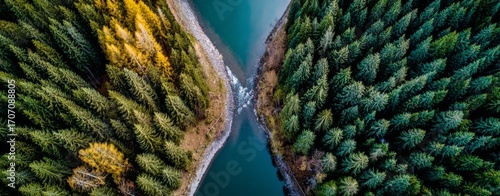 Obraz premium From above, a peaceful natural landscape reveals lush green forest islands encircled by calm and serene blue water