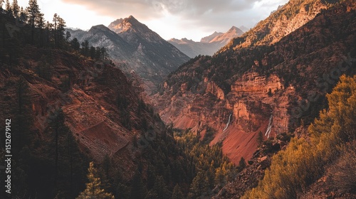 Fototapeta premium From above, a thriving forest of lush greenery is visible, complete with a twisting path that navigates the trees, and what could be the overgrown remains of a long-abandoned, ancient settlement