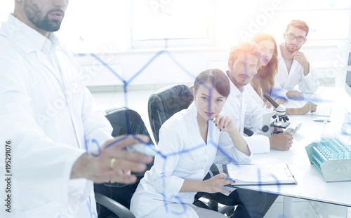 Obraz premium from behind the glass. a scientist standing near the blackboard