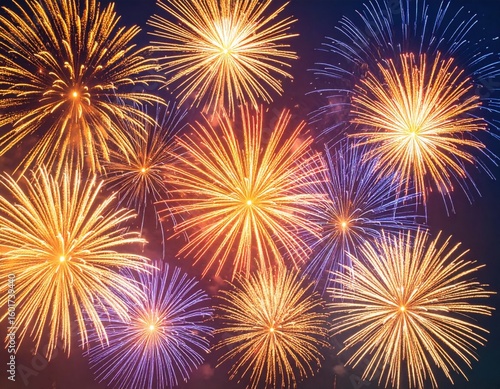 © Faqih, Fototapeta premium From below shot of wonderful vivid fireworks exploding on background of black night sky